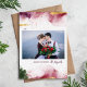 Moderne, individuell bedruckte Weihnachtskarten mit einer einfachen DIY-Vorlage zum Anpassen. Dieses künstlerische Design hat einen abstrakten Spritzer Hintergrund in den Farbtönen Bordeaux, Grün und Gold. Fügen Sie Ihr Foto, persönliche Begrüßung, Namen und das Jahr. Verwenden Sie die Entwurfswerkzeuge, um die Schriftart und Farben zu bearbeiten. Die Rückseite hat Platz, um mehr Fotos und Text hinzuzufügen.