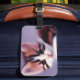 Dieses Gepäckanhänger hat ein künstlerisches Kätzchen darauf.