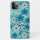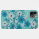 Ein Gehäuse mit Blumenmuster auf hellblauem Hintergrund. Das Muster besteht aus blauen und weißen Blume mit dunklen Zentren, grünen Blätter und kleinen rosa Beeren. Die Blume sind dicht, überlappend angeordnet und schaffen ein reichhaltiges und strukturiertes Design. Das Gehäuse ist glänzend, die Kameraobjektive sind in der oberen links Ecke sichtbar. Der Gesamtstil ist feminin und dekorativ, wobei der Schwerpunkt auf natürlichen Elementen liegt. Die Farbpalette ist weich und beruhigend, mit einer Mischung aus coolen und warmen Farbtönen.