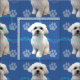 Niedlicher maltesischer Hund auf blauem Hintergrund mit Pfotendrucken und Tracks in Grau, Rosa und Blau. Das Originalfoto wurde modifiziert, um ihm ein gemaltes Aussehen zu verleihen.