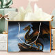 Ein majestätischer Drache mit Kupfer-, Gold- und schwarzen Skalen auf einer Klippenkante mit blauem Himmel dahinter.