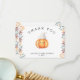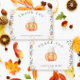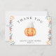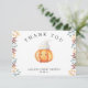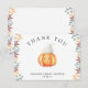 "Ein kleiner Kürbis ist unterwegs. Feiern Sie mit diesem Baby Cartoon Kürbis Thema für Baby Dusche Party! Wasserfarbener niedlicher Cartoon Kawaii Kürbis mit Herbstmütze (Kappe) und Herbstlauben. Auf der Rückseite der Karte befinden sich Herbstblätter.
