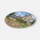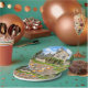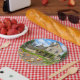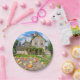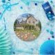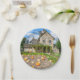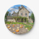 Eine schöne Aussicht auf einen Kürbispflaster vor einem Bauernhaus, das auf einer Papiertüte gedruckt ist.