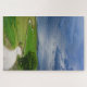 Puzzle einer Fotografie eines weißen Schotterwegs der Wicklung (strada bianca) durch die grünen Hügel des Rollens der Val d'Orcia Tallandschaft in Toskana, Italien unter dunklen Wolken im Himmel.