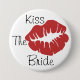 Text liest: "Küssen Sie die Braut". Roter Lippenstiftkuß auf der Mitte dieses Knopfes. Idealer Zusatz, zum auf der Nacht des Mädchens heraus zu tragen. Genießen Sie diesen Junggeselinnen-Abschied in der Art!