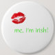 Knöpfen Sie mit den Rotlippen auf einem weißen darstellenden Hintergrund, dass ein Kuss und im Grün der Text "mich küssen, den ich! irisch bin". Groß, an St Patrick Tag zu tragen.