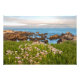 Eine malerische Küstenlandschaft entfaltet sich im Vordergrund des lebendigen grünen Grasgrases, gepaart mit zarten Küstenstädten. Die Blume blühen in Haufen und fügen der üppigen Landschaft einen Farbtupfer hinzu. Im Hintergrund erstreckt sich der riesige blaue Ozean über eine felsige Küste. Die Felsen sind verwittert und zerklüftet, was der Szene ein Gefühl von natürlicher Schönheit verleiht.