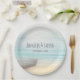 Hochzeitsarbeit Teller mit einem schönen rustikalen Bild. Feine Farben von hellblau, sandig braun und sanft weiß. Eine Strandlandschaft mit einem Boot am Ufer mit einem Fischernetz, das an der Seite hängt. Ein eleganter, schäbiger Look.