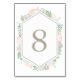 Die schicken Strandkarten in sanften Sandtönen, Aqua, Pfirsich und Grün mit einem lang gestreckten Sechseck, umgeben von Meeresbildern wie Seestern, Muscheln, Nautilus-Muscheln und Seetang, mit der Tischnummer in der Mitte. Design wiederholt sich auf der Rückseite. Koordiniert mit unserer Hochzeitssuite "Seaside Pastels".