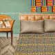 Eine abstrakte Grafik, ähnlich Aztekenkunst, Muster, verbindet eine blendende Mischung aus Orange, Rot, Gelb, Taupe, Blau und Schwarz mit einem Kwanzaa Urlaub, Gruß.