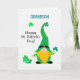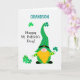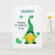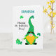 Une carte de voeux amusante pour votre petit-fils le jour de la Saint Patrick, avec un leprechaun mignon, tenant un shamrock. Le leprechaun a un très grand casquette, dans un motif vert, une grande barbe de gingembre, un nez énorme, des manches rayées, des chaussettes et des chaussures noires. En haut, en lettres vert foncé, est le mot "GRANDSON" et le message intérieur est facile à customiser ou à supprimer.