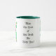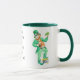 Une tasse blanche avec une poignée et une jante vert foncé. Un motif "leprechaun", dos et avant, est séparé par l'inscription : "Que la chance des Irlandais soit avec vous !"