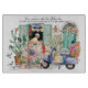 Bring the warmth of la cocina de la abuela into your home with this beautiful decorative glass cutting board. Featuring a soft, watercolor illustration of an abuela at her window, papel picado fluttering above, blooming plants, a vintage scooter, and pigeons gathering below, this piece captures the heart of everyday Mexican life.