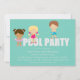 L'adorable invitation à la fête de la piscine porte les mots "pool party" avec des enfants en maillots de bain sur les lettres. La couleur Arrière - plan est le vert d'eau. Les champs de texte sont entièrement personnalisables.