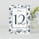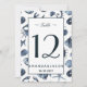 Élégante carte de table de mariage nautique inspirée d'un style côtier avec un motif de couleurs bleu et blanc comprenant hippocampe, sand dollars, coquillage, crabe et étoile de mer, texte personnalisé et détails du mariage