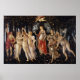 Cette peinture est exposée au musée des Offices. Cette peinture est pleine d'allégories (significations cachées), ce qui conduit à beaucoup de débats sur la façon d'interpréter la peinture. Dans le pré, vous pouvez voir des centaines de fleurs différentes. La figure bleue sur la droite est Zephyr, le dieu du vent occidental. Zephyr poursuit la nymphe Chloris, qui est associée aux fleurs et au printemps. Le souffle de Zephyr transforme Chloris en femme avec la robe ornée de fleurs (qui est considérée comme la déesse du printemps, appelée Flora). La figure centrale au milieu est Vénus. A gauche de Vénus, les trois Graces dansent. Les Grâces sont des divinités mineures dans la mythologie grecque. À gauche des Graces se trouve Mercure, le messager des dieux grecs, qui disperse les nuages avec son personnel. Certains disent que Mercure peut être modelé sur Lorenzo de’ Medici qui a commandé cette peinture. Sur le dessus de Vénus est Cupidon pointant sa flèche flamboyante à l'une des Graces. Une description plus détaillée de cette peinture peut être trouvée sur https://www.tripimprover.com/blog/la-primavera-by-sandro-botticelli.