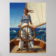 Eine schicke Art-Déco-Ölgemälde, die eine selbstbewusste Flapper an der Spitze eines Rennseglers darstellt. Ihre stilisierte geometrische Form wird durch dramatische, kontrastreiche Sonneneinstrahlung definiert, während sie durch das choppige indigoische Wasser navigiert.