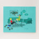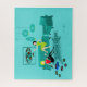 Elle ressemble à elle va être un temps d'amusement avec le ce nuit de rétros filles kitschy' dans le puzzle. Le style des années 1960, les caractéristiques de conception minimalistes d'art deux femmes avec les cocktails roses complètement à une moitié du siècle salon moderne, d'aqua et de turquoise. Ces dames savent certainement détendre. La beauté d'une chevelure de corbeau dans le flirty, robe de vert lounging sur le sofa atomique. Son compagnon blond s'assied sur une couverture d'impression de zèbre, utilisant une agrostide blanche et un pantalon serré et noir. Les appareils d'éclairage et de lampion de cru, de joueur de disque vinyle ont placé l'humeur. Encadré, âge d'espace, copie d'art de globe accroche au-dessus du sofa de mod.
