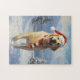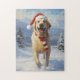 Farbenfrohe Gestaltung eines glücklichen Labradors mit einer Weihnachtsmannmütze, die durch die schneebedeckten Berge läuft und wünscht frohe Weihnachten.