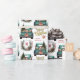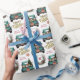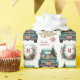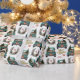 Ein aquamariner blauer Lieferwagen LKW trägt einen verzierten Holiday Baum und Geschenkpackungen auf diesem niedlichen Geschenkpapier. Ein bezaubernder, gelber Labrador Retriever Welpe trägt einen Weihnachtshut und flüchtige Blick über der Hecktür. Ein hölzernes Schild auf der hinteren Stoßstange sagt "Weihnachtsmann". Ihr Monogramm ist in einem hübschen Kiefernzapfen und einem roten Beerenkreu eingefasst, und der stilisierte Goldtext sagt "Frohe Weihnachten". Sie können auch den Text "aus dem (Name)" anpassen.