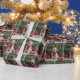 Ein Labrador Retriever mit Rentieranhängern und einem roten Schal sitzt glücklich vor einem verzierten Weihnachtsbaum