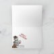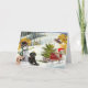 Carte de Noël Ultimate Labrador Retriever avec quatre Labs, un bonhomme de neige et des lapins lapins qui passent une journée de traîneau sur un banc de neige recouvert de neige colorée.