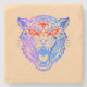 Diese lebendige Abbildung zeigt das Gesicht eines Tigers in einem Stammesdesign mit fett roten, blauen und lila Farbverläufen. Die detaillierten Muster schaffen ein erbittertes, aber künstlerisches Aussehen, Set vor einem dunklen Hintergrund.