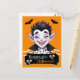 Diese Halloween-Postkarte enthält einen lächelnden Vampir, der seine Reißzähne zeigt, mit umherfliegenden Fledermäusen.