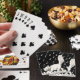 Dieses Kartenspiel ist schwarz, mit weißen Noten bedeckt, und eine glückliche, flauschig weiße Katze, die beim Winden über Klaviertasten läuft.