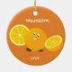Ein Weihnachtsschmuck mit einem lächelnden orangefarbenen Cartoon-Charakter. Diese süße Figur lächelt zwischen Orangenscheiben. Das Ornament ist zweiseitig mit einem orangen Hintergrund gestaltet. Das Design beinhaltet einen individuell anpassbaren Namen und ein individualisierbares Jahr.