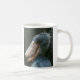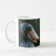 Im nahen-up lächelt ein Schoebill mit offenem Schnabel, der einen Blick auf seine Zunge freigibt. Der majestätische Vogel strahlt Charme und Pracht aus und besticht durch seine imposante, aber freundliche Präsenz.