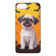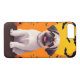 Cartoon-Stil Illustration eines lächelnden Mops sitzend vor einem lebendigen orangefarbenen Hintergrund. Hinter ihm erhebt sich ein großer gelber Vollmond, umgeben von fliegenden schwarzen Fledermäusen. Auf beiden Seiten des Mops gibt es zwei gemeißelte Kürbisse, die jeweils ein schelliges Gesicht haben.