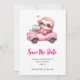 Save the Date Karte mit einer skurrilen Abbildung. Ein rosa Faultier, das in einem rosa Cabrio herumfährt. Schön.