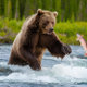 Dieses Lachs-Fishing-Grizzly-Bären-Puzzle bietet ein Actionshot-Bild direkt aus einer naturdokumentarischen Reihe. Ein riesiger Grizzlybär, der in einem überwältigenden Fluss stehend ist, wird rechtzeitig gefroren, wenn er bei einem springenden Lachs schwimmt. Ein lebendiges und aktionsreiches Bild, das vor einem ansonsten friedlichen Hintergrund eines dichten Waldes großer Kiefernbäume hervorgehoben wird. Dieses Braunbärenpuzzle wird alle Grizzlybären-Liebhaber begeistern und begeistern, besonders diejenigen, die das Naturpuzzle Liebe haben.
