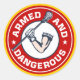 Lacrosse Design - Bewaffnete und gefährliche Aufkleber. Zirkuläres Emblem-Design des muskulösen Arms mit Handschuh-Lacrosse-Stick. Lacrosse Aufkleber. Rot und Gelb. Geschenke und Ausrüstung für Lacrosse Spieler und Fans.