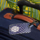 Lacrosse Fanggerätetasche oder Gepäckanhänger mit laxem Mesh und Ball-Design auf marineblau-blauem Hintergrund.