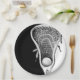 Coole Lacrosse Party- oder Sportveranstaltungs-Teller mit laxen Stab- und Ballkunst auf schwarzem Hintergrund für Lacrosse Sports Party oder Teamevent.