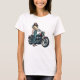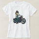 This is a digital illustration of a confident woman standing next to a classic red and silver motorcycle. The woman has long, wavy brown hair, wears sunglasses, a beige short-sleeved top, and blue jeans rolled at the cuffs. She is barefoot, with a casual yet stylish demeanor. The background features a stylized orange sun, giving the image a retro, 1970's-inspired vibe. The motorcycle has a polished chrome finish and detailed engine components. The overall style is reminiscent of comic book art, with bold lines and vibrant colors.