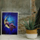 In einem skurrilen, Vintagen Foto sitzt eine Frau anmutig auf dem Halbmond, umgeben vom sanften Glühen weit entfernter Sterne. Sie trägt ein elegantes, fließendes Kleid, das sich um sie zieht, und ihre Augen strahlen mit einem Gefühl des Staunens aus. In ihrer Hand hält sie eine Laterne, die wie ein Stern geformt ist, mit sanftem Licht, das eine traumhafte Aura ausstrahlt. Die Szene fängt ein Gefühl der Verzauberung ein, als sei der Mond selbst ein magischer Höhepunkt für eine Himmelsmuh.