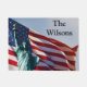 "Feiern Sie den amerikanischen Stolz mit diesem beeindruckenden Design mit der amerikanischen Flagge, die im Wind hinter der ikonischen Freiheitsstatue weht. Ein gewagtes und patriotisches Bild, das perfekt für jeden Anlass ist, der Freiheit und Freiheit ehrt."