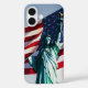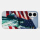 "Feiern Sie den amerikanischen Stolz mit diesem beeindruckenden Design mit der amerikanischen Flagge, die im Wind hinter der ikonischen Freiheitsstatue weht. Ein gewagtes und patriotisches Bild, perfekt für jeden Anlass, der Freiheit und Freiheit ehrt."