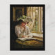 Viktorianische Frau, die einen modischen Hut trägt, sitzt am Fenster und liest. Wenn man durch das Fenster blickt, sieht man weiche rosa Rosen. Bildende Kunst von Thomas Kinnington c1889.
