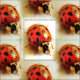 Dieses Tiergewebe weist ein sich wiederholendes Muster eines Ladybugs (Coccinellidae) auf, der auch als Ladybird, Damenkuh oder Damenkäfer bekannt ist, mit roten, orangen und gelben Farbtönen und schwarzen Flecken. Dieses Insekt ist ein bekannter Freund des Gärtners, der auf Blattläden und anderen Gartenschädlingen füttre.