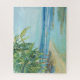 "Blue Coastal Lagoon" von Suzanne Wilkins. Ein ruhiger Strand mit tropischen Bäumen.