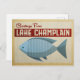 Dieses Greetings From Lake Champlain Vintage Reisedesign besticht durch einen lustigen blauen Fisch mit roten Akzenten und ein Retro-Ambiente aus den 60er Jahren.