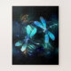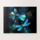 Zwei lichtdurchflutete, türkisfarbene, kunstvoll gezeichnet Libellen mit lichtdurchlässigem Sealgen und Glühwürmchen im Hintergrund. Glühende Libelle.