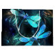 Zwei lichtdurchflutete, türkisfarbene, kunstvoll gezeichnet Libellen mit lichtdurchlässigem Sealgen und Glühwürmchen im Hintergrund. Glühende Libelle.