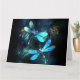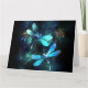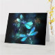 Zwei lichtdurchflutete, türkisfarbene, kunstvoll gezeichnet Libellen mit lichtdurchlässigem Sealgen und Glühwürmchen im Hintergrund. Glühende Libelle.