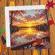 A beautiful blank notecard for a friend or family member with a pretty illustration of a sunrise in the morning over a lake while sitting on a back deck, drinking coffee.