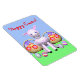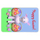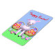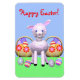 Ein fröhlicher Ostermagnet mit meinem Kunstwerk eines niedlichen und fröhlichen Lamm-Charakters, Körben mit Ostereiern und bunten Blume.